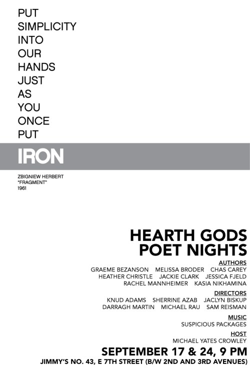 I am happy to report that several poems from my chapbook Red Fortress (H_NGM_N) are being turned into short theater pieces for Hearth Gods’ first Poet Nights.